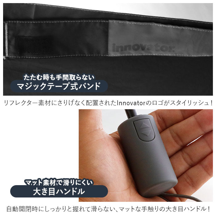 ・幅が広めにデザインされたバンドはマジックテープ式でサッと傘が広げやすく、生地をたたむ時にも手間取らない。リフレクター素材にさりげなく配置されたInnovatorのロゴがスタイリッシュ!