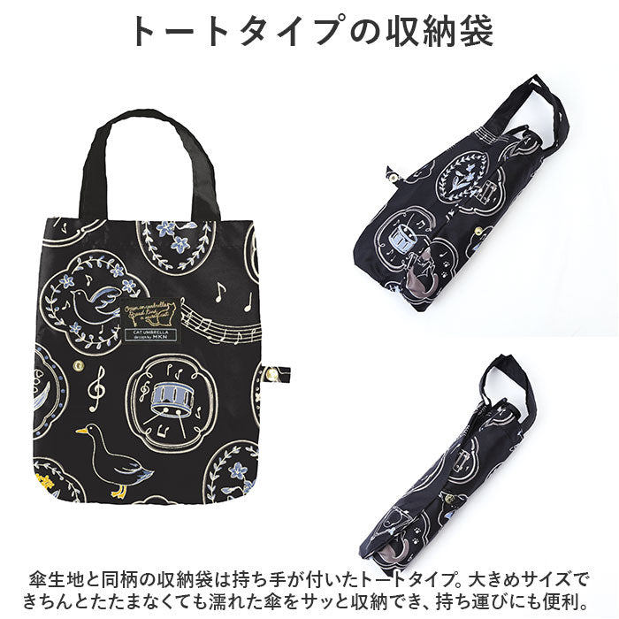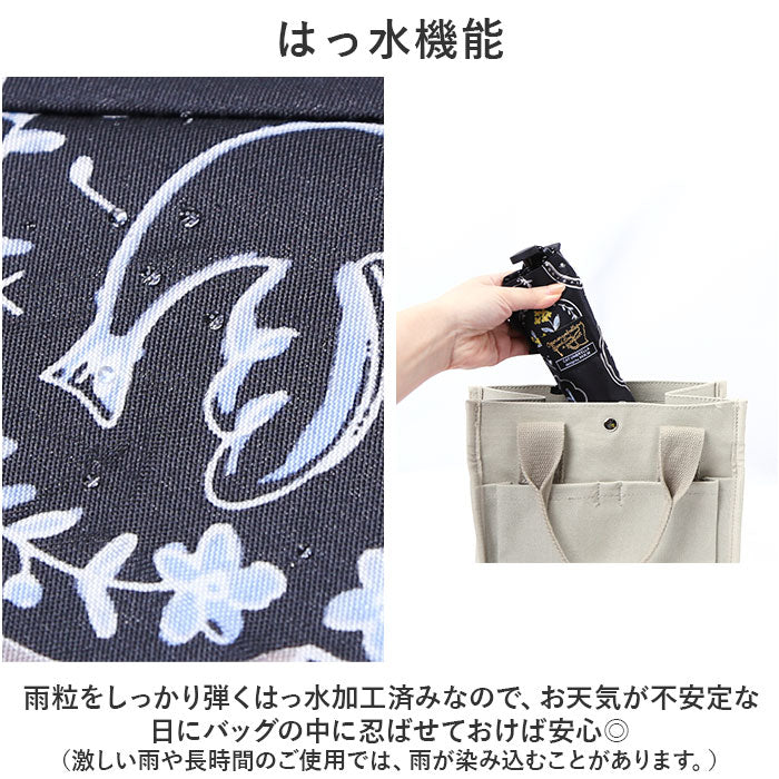 ・傘生地と同柄の収納袋は持ち手が付いたトートタイプ。大きめサイズできちんとたたまなくても濡れた傘をサッと収納でき、持ち運びにも便利。