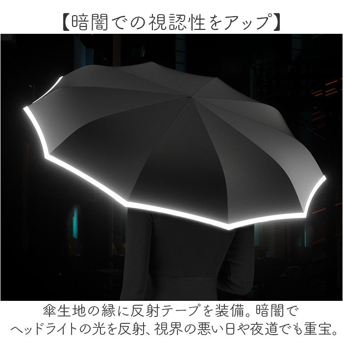 ・傘生地の縁に反射テープを装備。暗闇でヘッドライトの光を反射、視界の悪い日や夜道でも重宝。