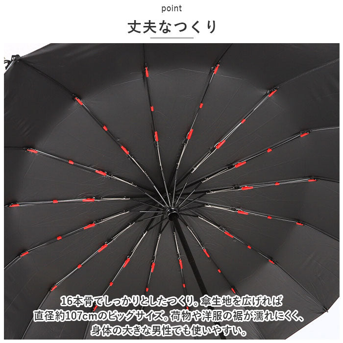 ・16本骨でしっかりとしたつくり。傘生地を広げれば直径約107cmのビッグサイズ。荷物や洋服の裾が濡れにくく、身体の大きな男性でも使いやすい。