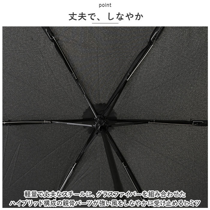 ・軽量で丈夫なスチールに、グラスファイバーを組み合わせたハイブリッド構成の親骨パーツが強い風をしなやかに受け止めるヒミツ。
