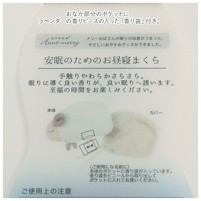 ・ヒツジさんのおなか部分のポケットに、安眠効果とリラックス効果の高い、ラベンダーの香りビーズの入った「香り袋」付き。