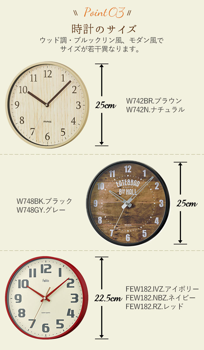 ・お部屋のテイストに合わせて選べるインテリアクロック。