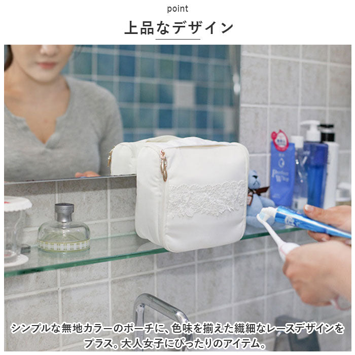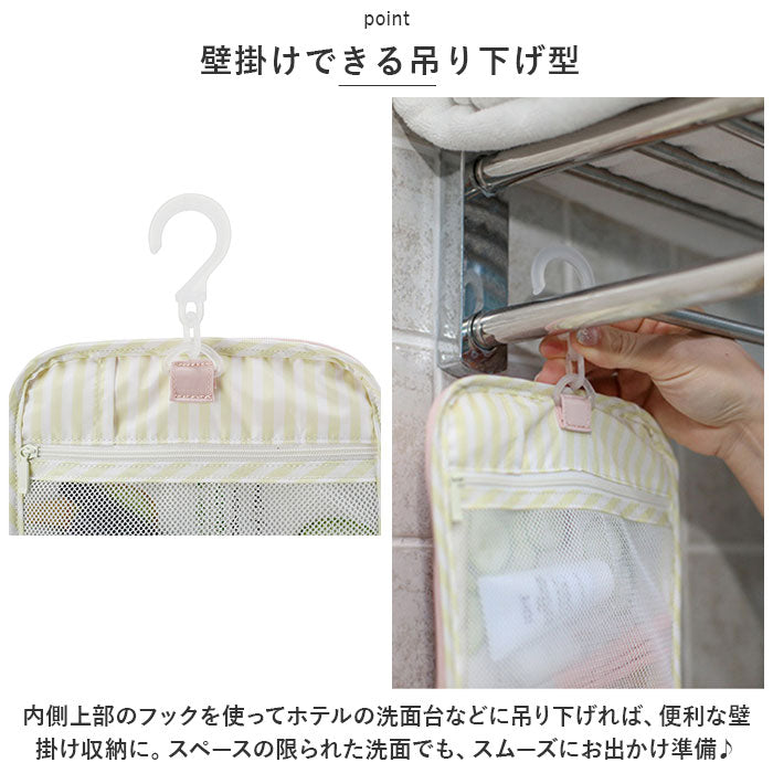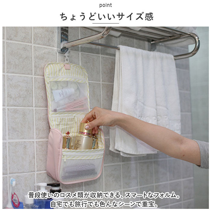 ・内側上部のフックを使ってホテルの洗面台などに吊り下げれば、便利な壁掛け収納に。スペースの限られた洗面でも、スムーズにお出かけ準備♪
