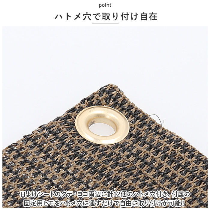 ・日よけシートのタテ・ヨコ両辺に計12個のハトメ穴付き。付属の固定用ヒモをハトメ穴に通すだけで自由に取り付けが可能!
