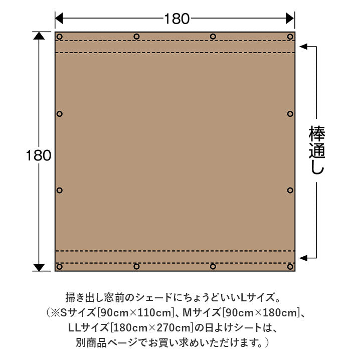 ・掃き出し窓前のシェードにちょうどいい「180cm×180cm」のLサイズ。(※Sサイズ[90cm×110cm]、Mサイズ[90cm×180cm]、LLサイズ[180cm×270cm]の日よけシートは、別商品ページでお買い求めいただけます。)