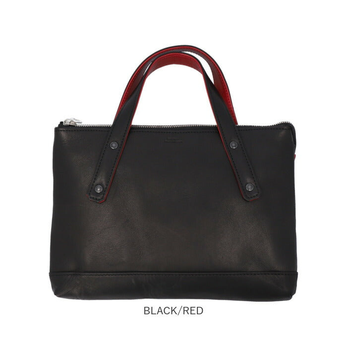 ・ハンドルの内側など一部に異なるカラーのレザーを使用。また、バッグ内のレザーパッチやフロントの型押し、ボタンにさりげなくロゴを刻印。