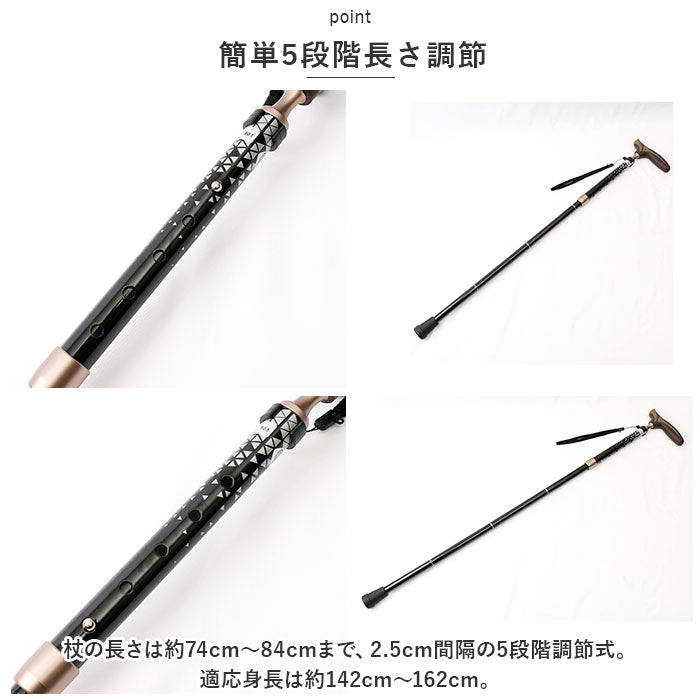 ・杖の長さは約74cm~84cmまで、2.5cm間隔の5段階調節式。適応身長は約142cm~162cm。