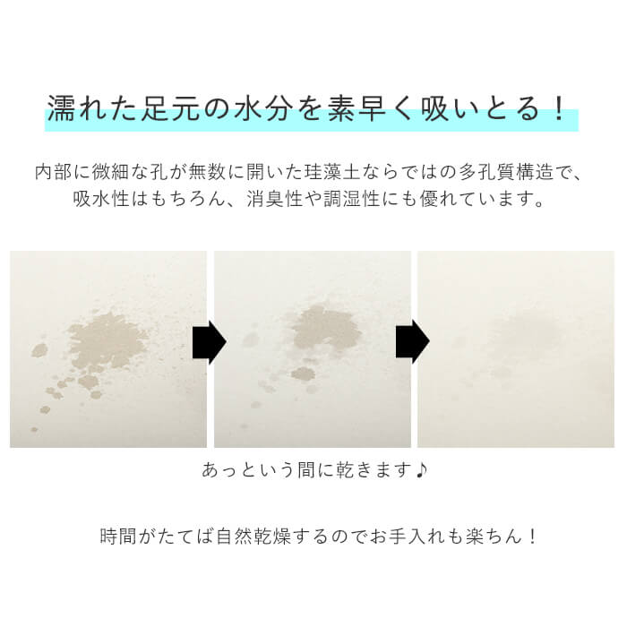 ※珪藻土の粒子が水に溶けだし、表面に小さな穴があいたり、金属などで削れて跡が残る場合がありますが、機能上問題ございません。
