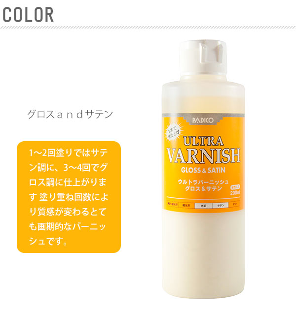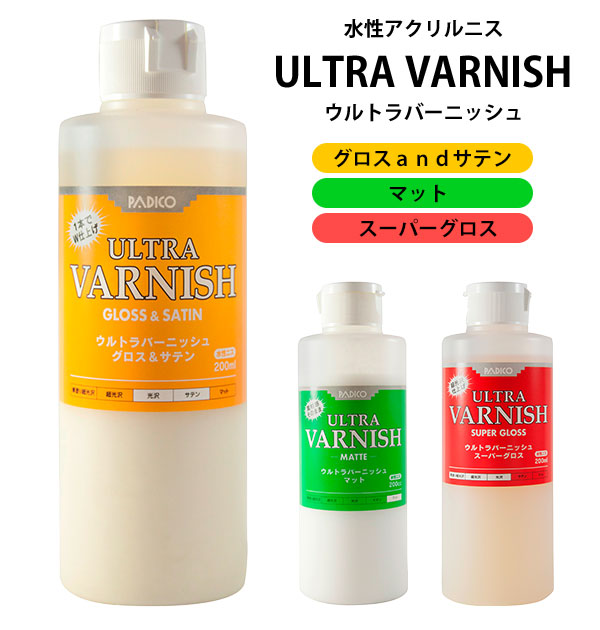 水性ニス 200ml PADICO パジコ 通販 ウルトラバーニッシュ ULTRA VARNISH ニス 水性 合成樹脂塗料 水性アクリルニス 光沢仕上げ スーパーグロス W仕上げ グロス&サテン 素材感 つや消し マット 重ね塗り 生活防水 生活耐水 仕上げ剤 粘土 クラフト クレイクラフト 手芸