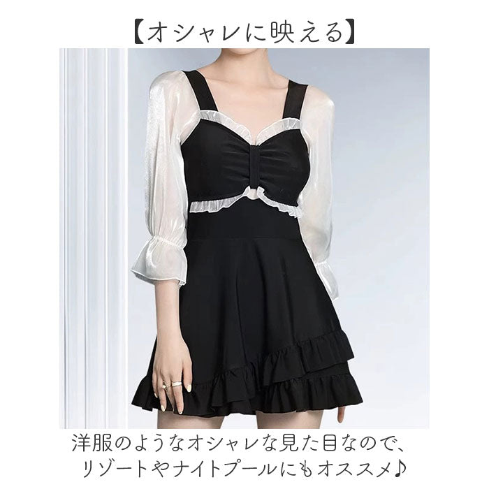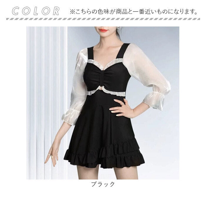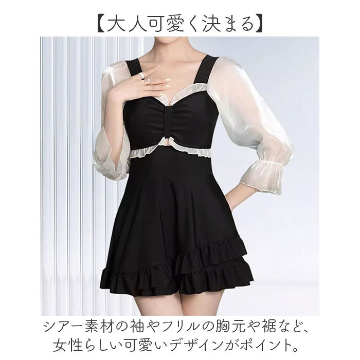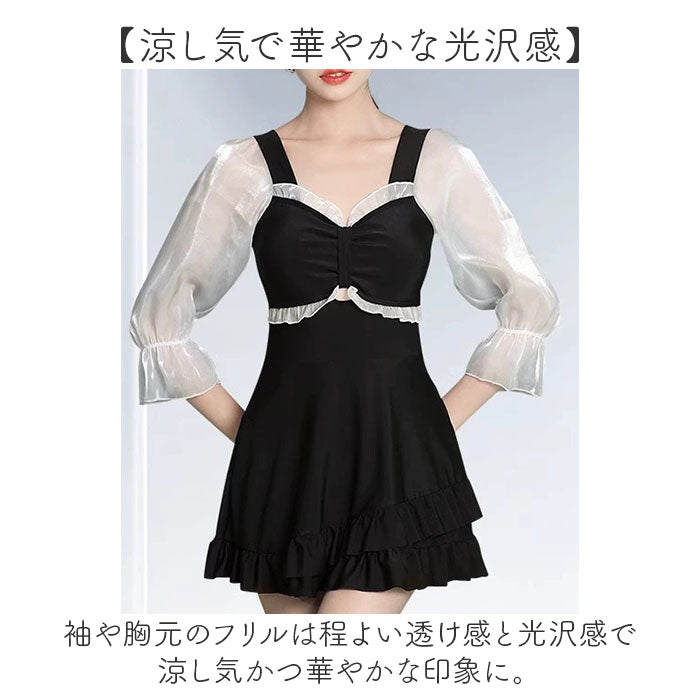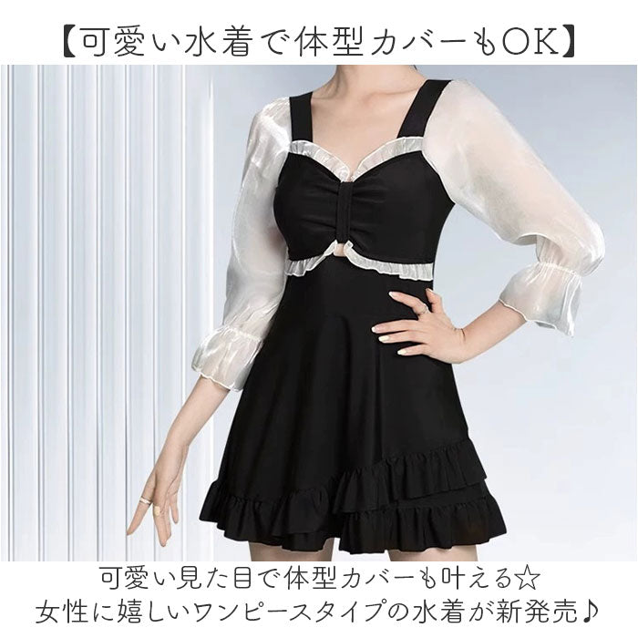 水着 ワンピース レディース フリル 通販 スイムウェア ワンピース水着 水陸両用 長袖 インナーパンツ付 可愛い かわいい 体型カバー ゆったり 通気性 伸縮性 耐久性 夏 プール 海 海水浴