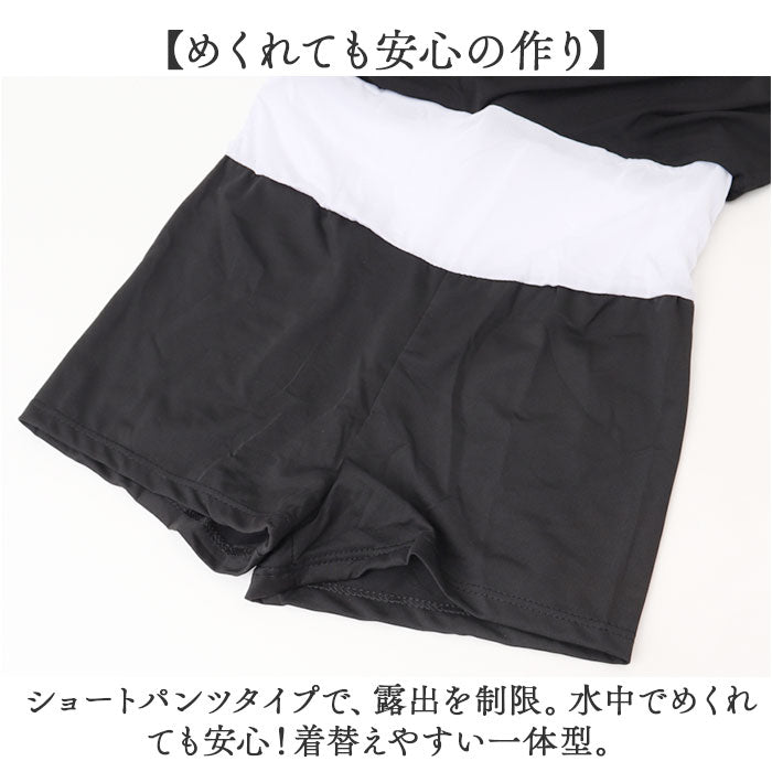 ・ショートパンツタイプで、露出を制限。水中でめくれても安心!着替えやすい一体型。