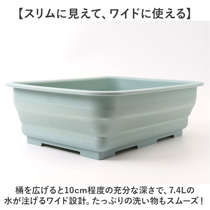 ・桶を広げると10cm程度の充分な深さで、7.4Lの水が注げるワイド設計。たっぷりの洗い物もスムーズ!