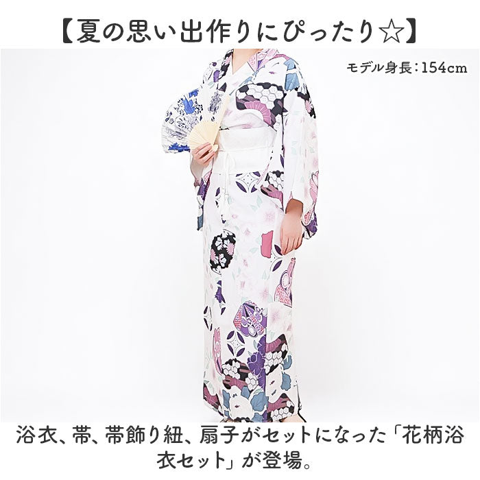 ・浴衣、帯、帯飾り紐、扇子がセットになった「花柄浴衣セット」が登場。