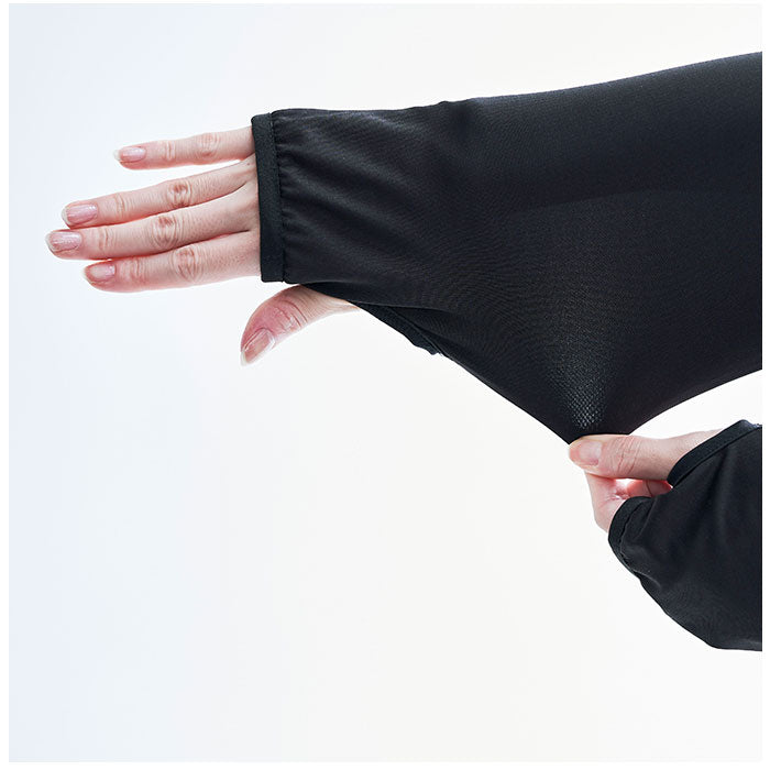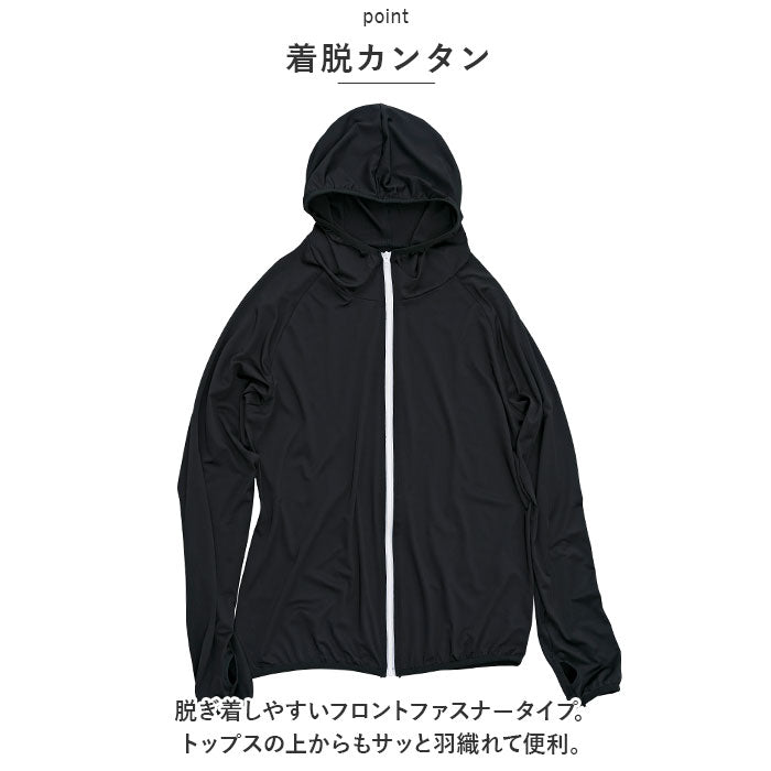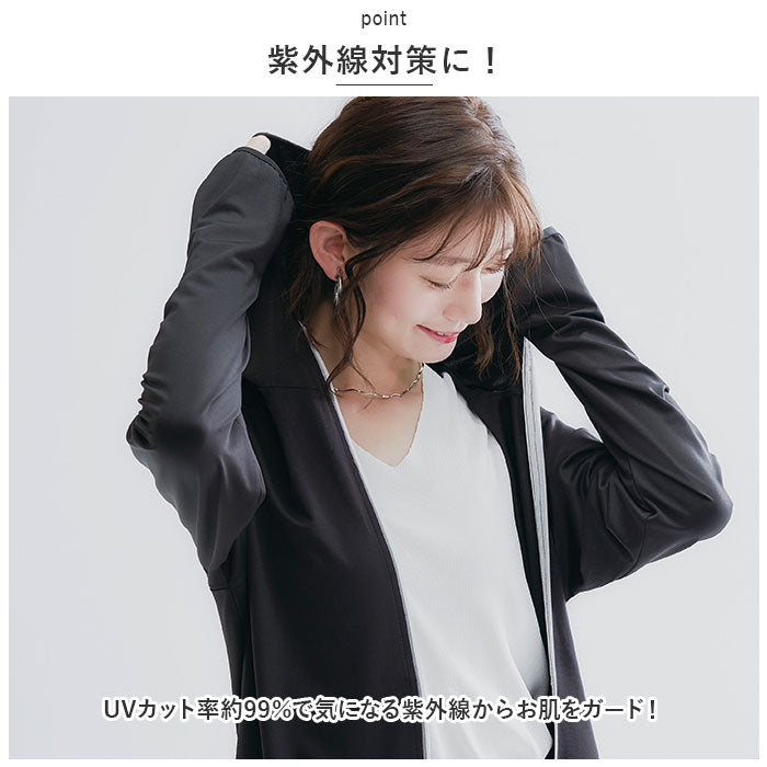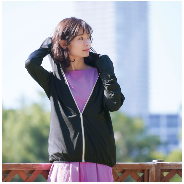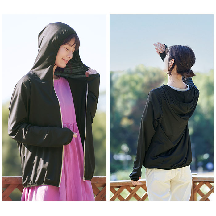 ・UVカット率約99%で気になる紫外線からお肌をガード!首元までカバーできるフードや、手の甲まで覆える親指ホール付き。