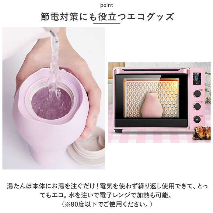 ・湯たんぽ本体にお湯を注ぐだけ!電気を使わず繰り返し使用できて、とってもエコ。水を注いで電子レンジで加熱も可能。(※80度以下でご使用ください。)