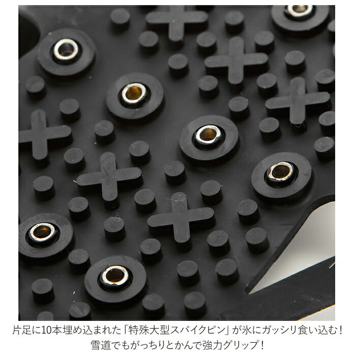 ・片足に10本埋め込まれた「特殊大型スパイクピン」が氷にガッシリ食い込む!雪道でもがっちりとかんで強力グリップ!
