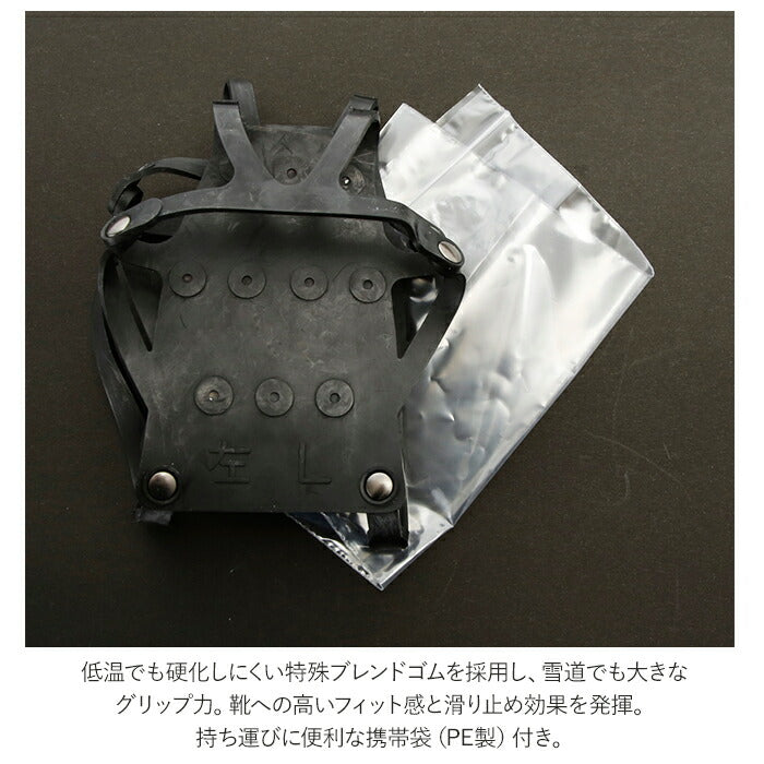 ・低温でも硬化しにくい特殊ブレンドゴムを採用し、雪道でも大きなグリップ力。その弾力性で靴への高いフィット感と滑り止め効果を発揮。