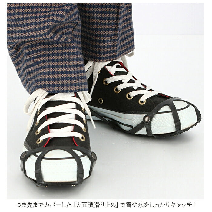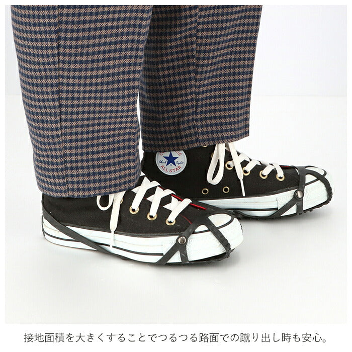 ・つま先までカバーした「大面積滑り止め」で雪や氷をしっかりキャッチ!接地面積を大きくすることでつるつる路面での蹴り出し時も安心。
