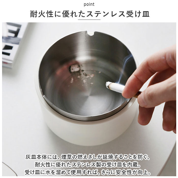 ・灰皿本体には、煙草の燃えさしが延焼することを防ぐ、耐火性に優れたステンレス製の受け皿を内蔵。受け皿に水を溜めて使用すれば、さらに安全性が向上。