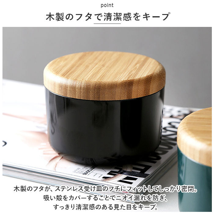 ・木製のフタが、ステンレス受け皿のフチにフィットしてしっかり密閉。吸い殻をカバーすることでニオイ漏れを防ぎ、すっきり清潔感のある見た目をキープ。