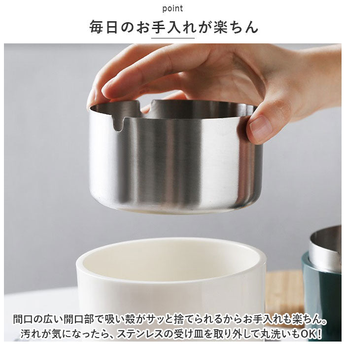 ・間口の広い開口部で吸い殻がサッと捨てられるからお手入れも楽ちん。汚れが気になったら、ステンレスの受け皿を取り外して丸洗いもOK!