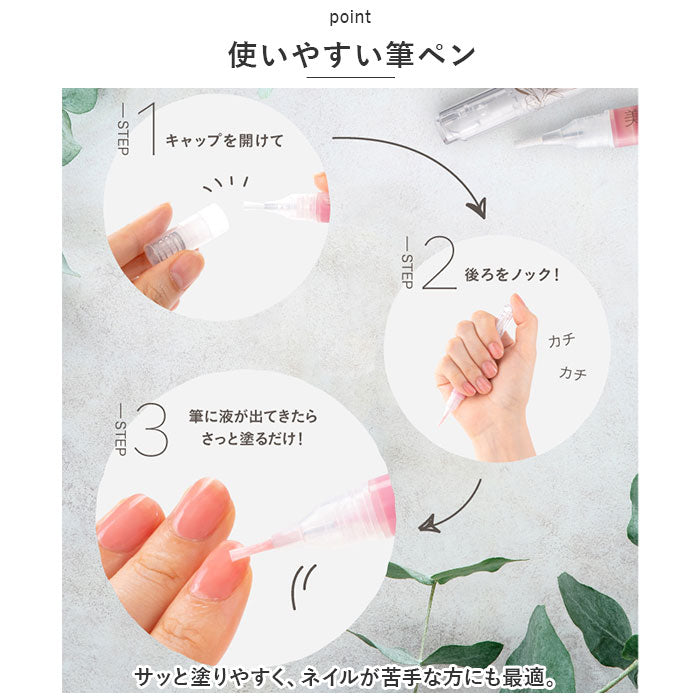 ・サッと塗りやすく、ネイルが苦手な方にも最適。いつでもどこでもケアできる速乾仕様で、忙しい毎日の味方☆ポーチに忍ばせておけるスリムなサイズ感。