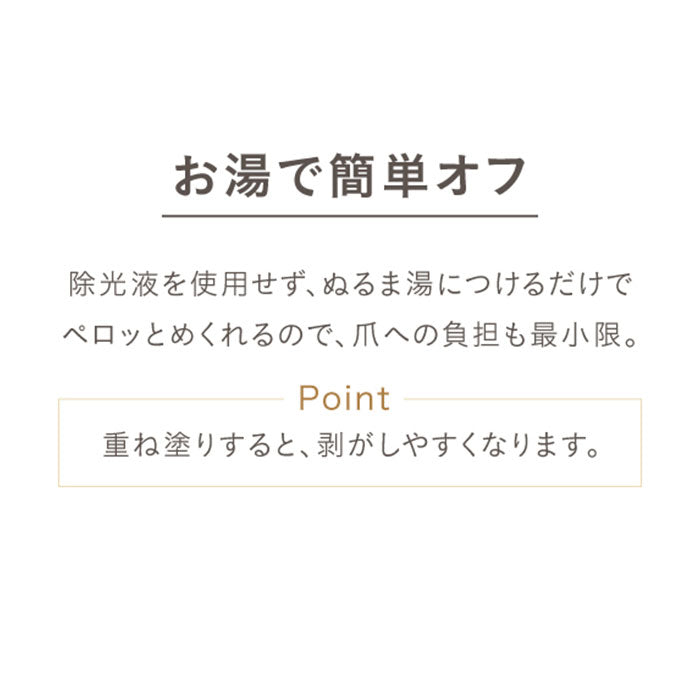 ・お湯でペロッと剥がせるから、除光液で爪を傷める心配も不要。