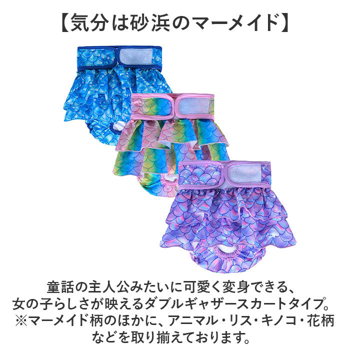 ・ポップな絵柄とひらひらのギャザーで可愛く変身!パッと見オムツに見えないお洒落なデザイン。