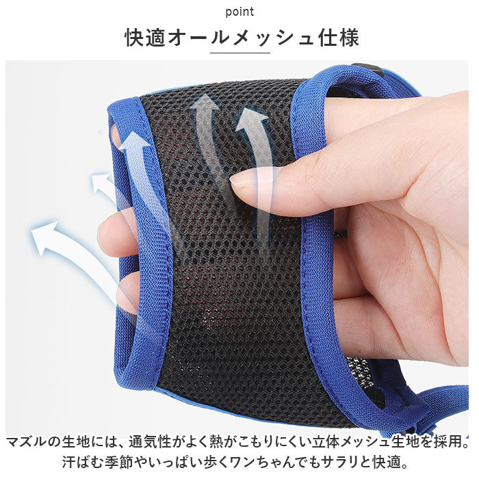 ・マズルの生地には、通気性がよく熱がこもりにくい立体メッシュ生地を採用。汗ばむ季節やいっぱい歩くワンちゃんでもサラリと快適。