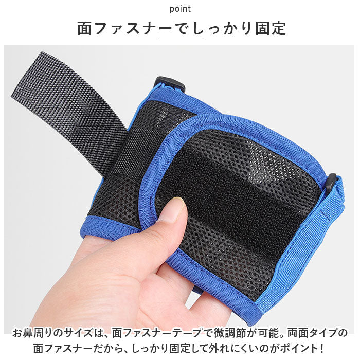 ・お鼻周りのサイズは、面ファスナーテープで微調節が可能。両面タイプの面ファスナーだから、しっかり固定して外れにくいのがポイント!
