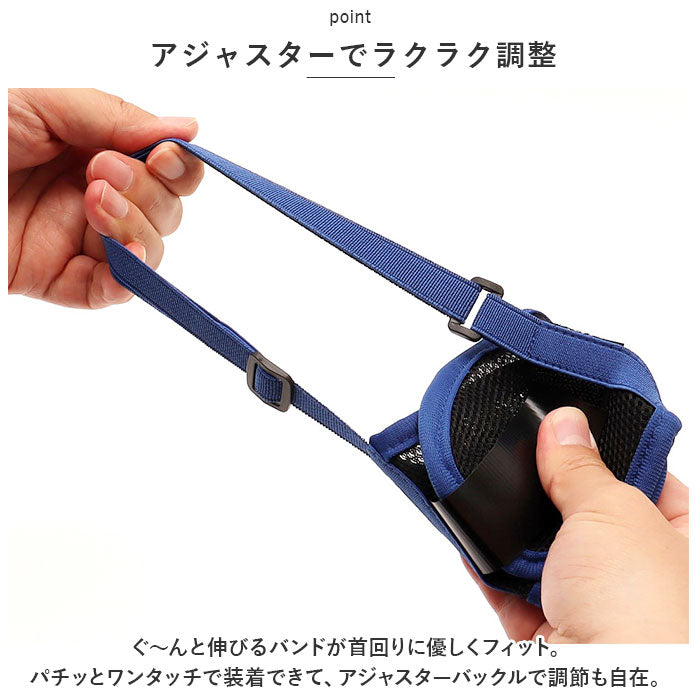 ・ぐ~んと伸びるバンドが首回りに優しくフィット。パチッとワンタッチで装着できて、アジャスターバックルで調節も自在。