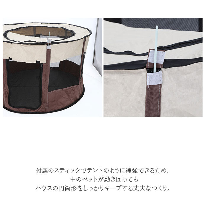 ・付属のスティックでテントのように補強できるため、中のペットが動き回ってもハウスの円筒形をしっかりキープする丈夫なつくり。
