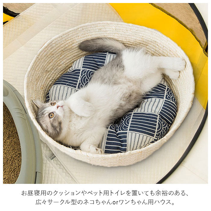 ・お昼寝用のクッションやペット用トイレを置いても余裕のある、広々サークル型のネコちゃんorワンちゃん用ハウス。