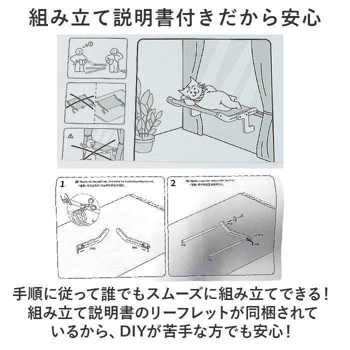 ・ハンモックを水平に支える架台の位置を前後に調整しながら、キャンバス生地のベッド奥にある金属フックを窓枠サッシに引っ掛けるだけで取り付けが簡単!(※引っ掛けフックの差し込み部は深さ3cm・奥行0.5cm以上必要です。)