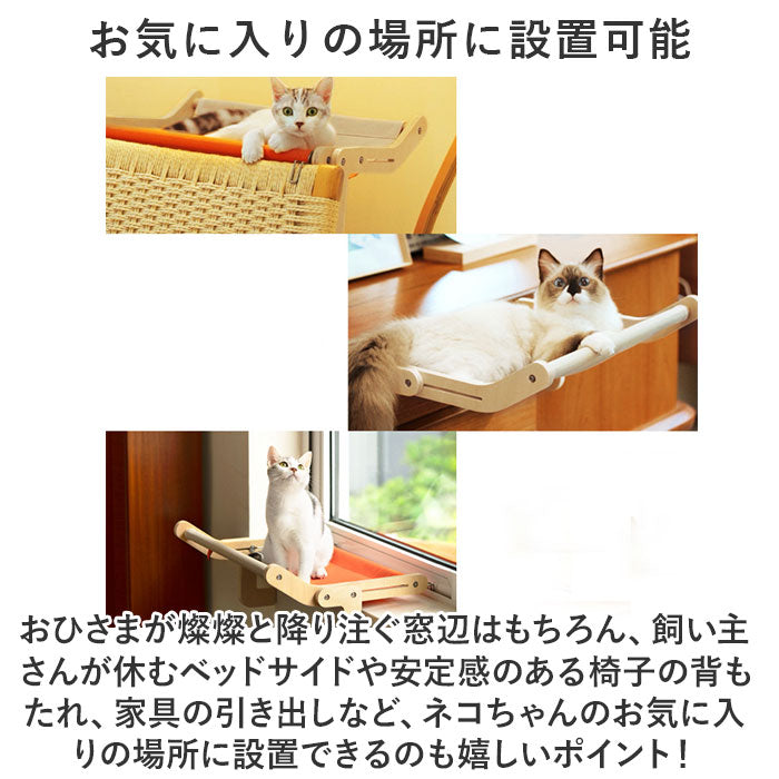 ・ひなたぼっこしながら、ゴロンとお昼寝♪ナチュラルな木製フレームとキャンバス生地がオシャレな、窓取り付けタイプのユニークなネコちゃん用ハンモック。