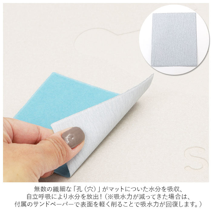 ・無数の繊細な「孔(穴)」がマットについた水分を吸収、自立呼吸により水分を放出!(※吸水力が減ってきた場合は、付属のサンドペーパーで表面を軽く削ることで吸水力が回復します。)