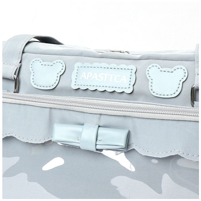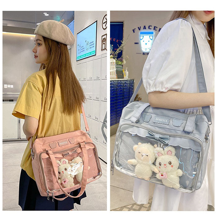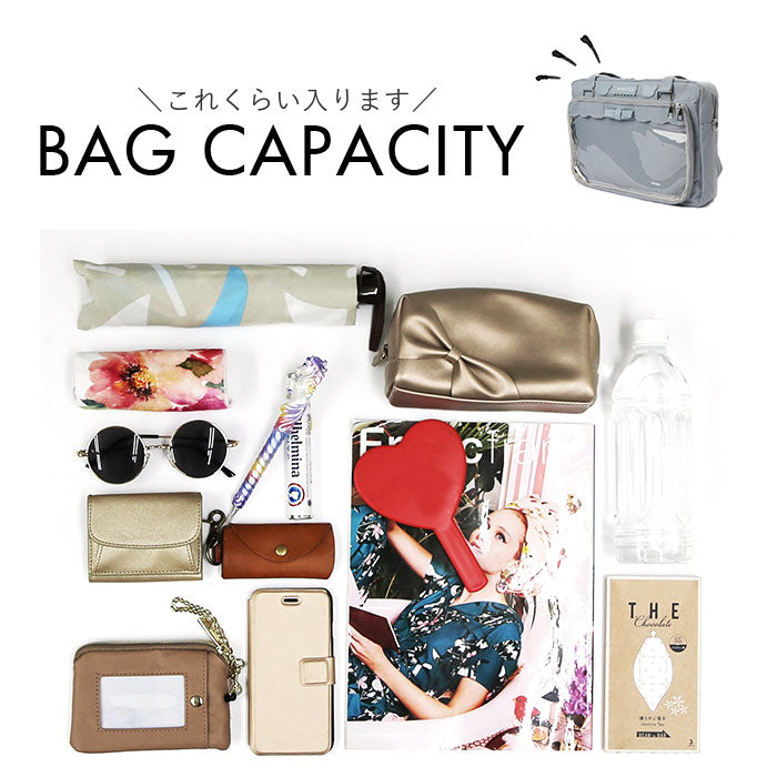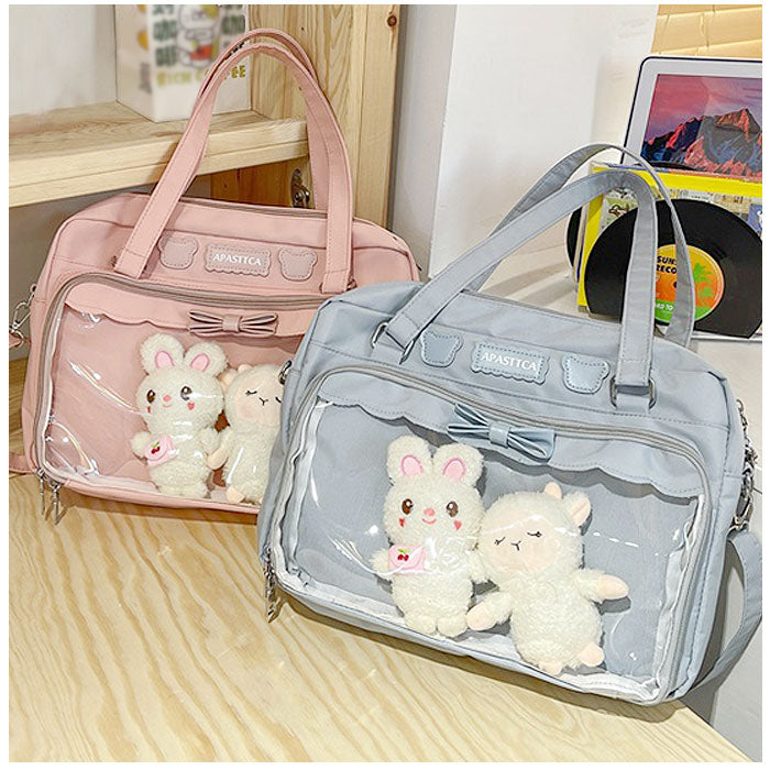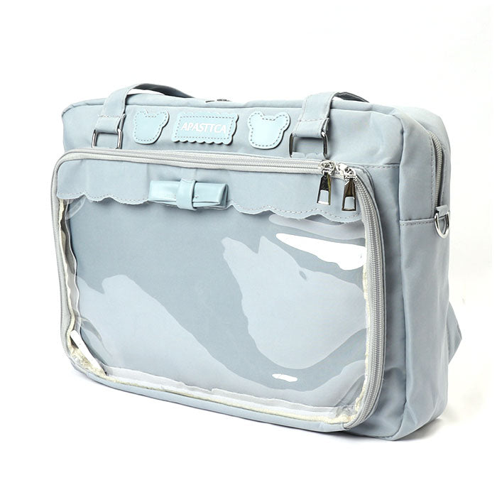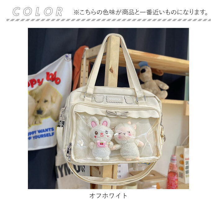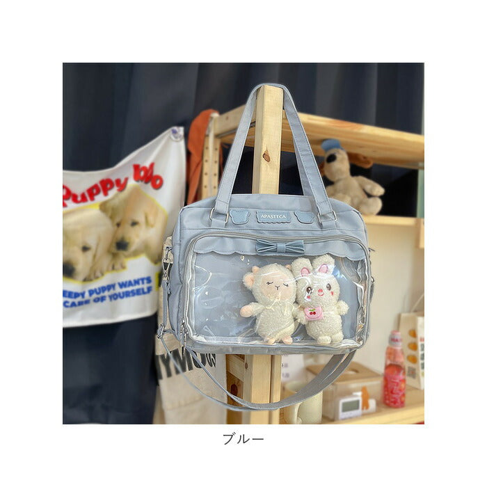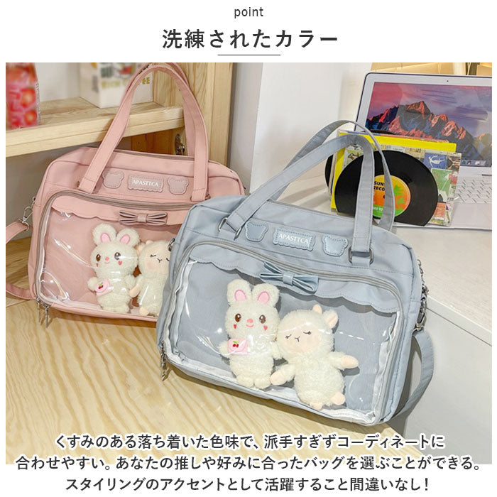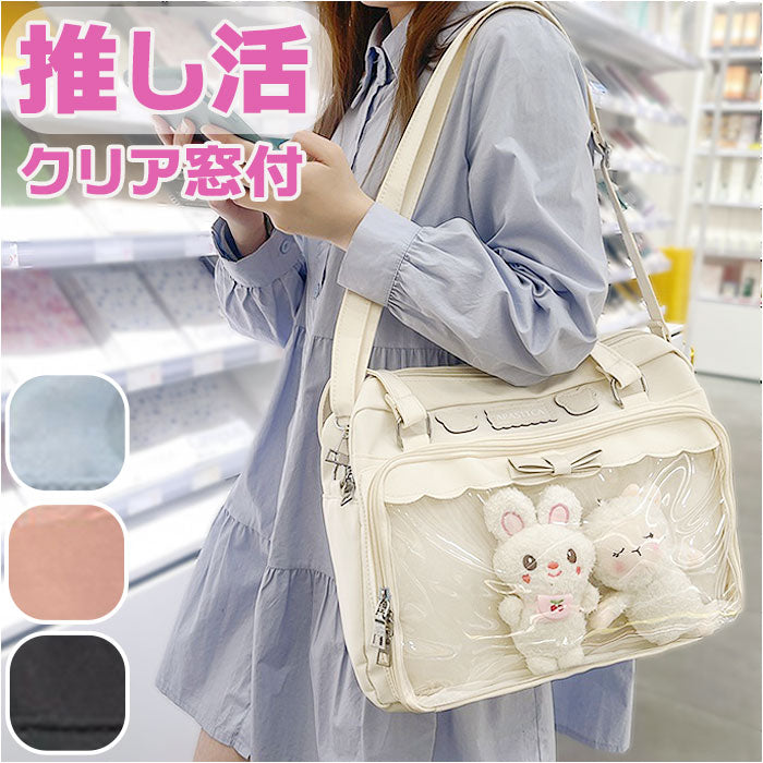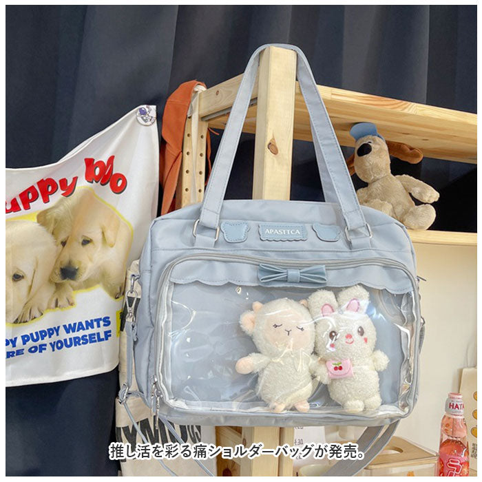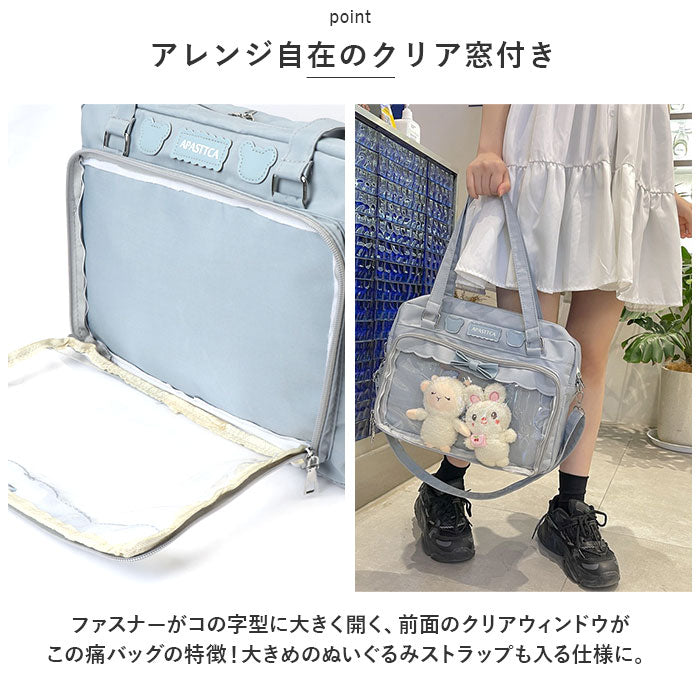 ・ファスナーがコの字型に大きく開く、前面のクリアウィンドウがこの痛バッグの特徴!大きめのぬいぐるみストラップも入る仕様に。