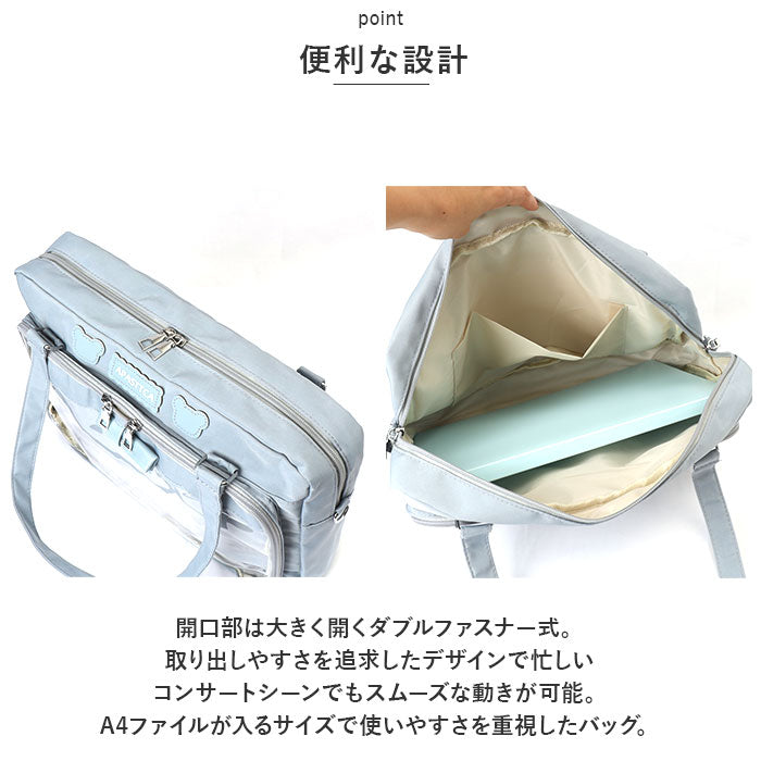 ・開口部は大きく開くダブルファスナー式。取り出しやすさを追求したデザインで忙しいコンサートシーンでもスムーズな動きが可能。A4ファイルが入るサイズで使いやすさを重視したバッグ。