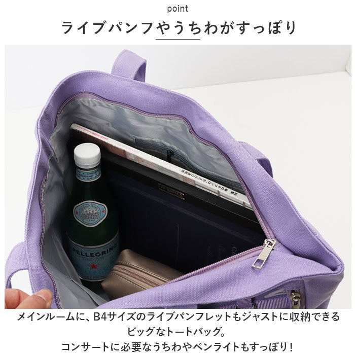 ・メインルームに、B4サイズのライブパンフレットもジャストに収納できるビッグなトートバッグ。コンサートに必要なうちわやペンライトもすっぽり!