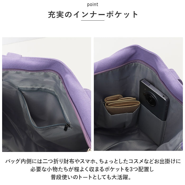 ・バッグ内側には二つ折り財布やスマホ、ちょっとしたコスメなどお出掛けに必要な小物たちが程よく収まるポケットを3つ配置し、普段使いのトートとしても大活躍。