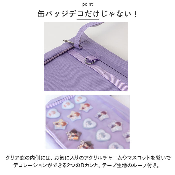 ・ファスナーがコの字型に大きく開く、前面のクリアウィンドウがこの痛バッグのヒ・ミ・ツ。「推し」の缶バッジや写真を入れて「推し色」にカスタマイズ自在。