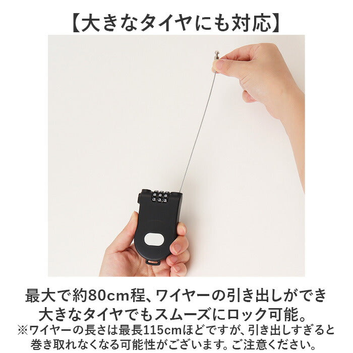 ・最大で約80cm程、ワイヤーの引き出しができ大きなタイヤでもスムーズにロック可能。※