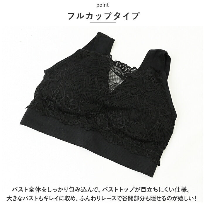 ・バスト全体をしっかり包み込んで、バストトップが目立ちにくい仕様。大きなバストもキレイに収め、ふんわりレースで谷間部分も隠せるのが嬉しい!