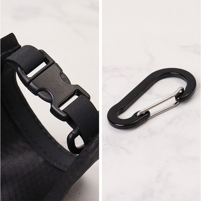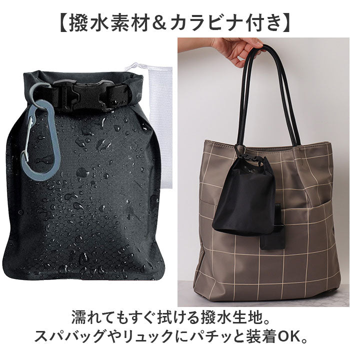 ・濡れてもすぐ拭ける撥水生地。スパバッグやリュックにパチッと装着OK。