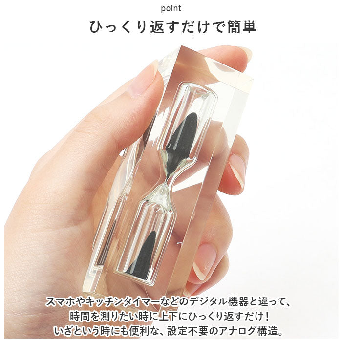・スマホやキッチンタイマーなどのデジタル機器と違って、時間を測りたい時に上下にひっくり返すだけ!いざという時にも便利な、設定不要のアナログ構造。