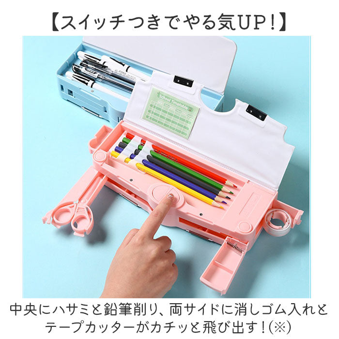 ・中央にハサミと鉛筆削り、両サイドに消しゴム入れとテープカッターがカチッと飛び出す!