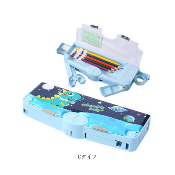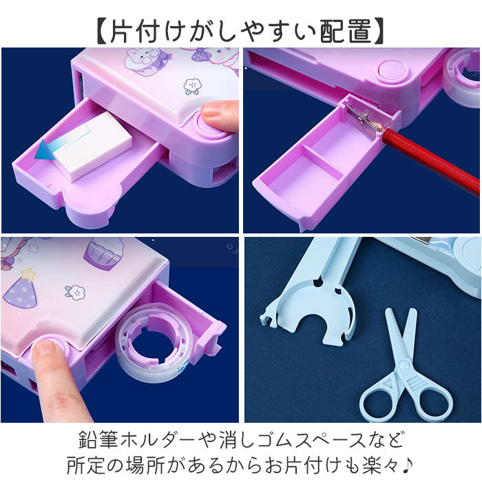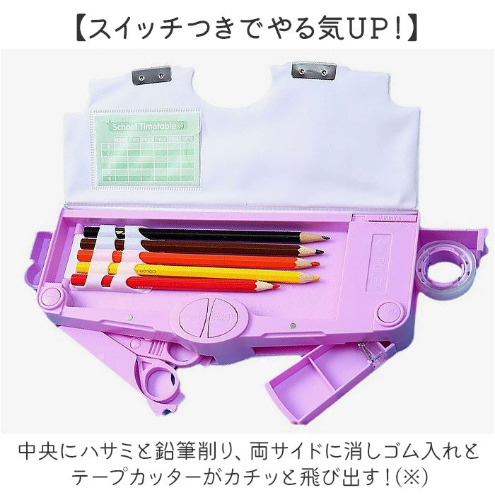 ・中央にハサミと鉛筆削り、両サイドに消しゴム入れとテープカッターがカチッと飛び出す!
