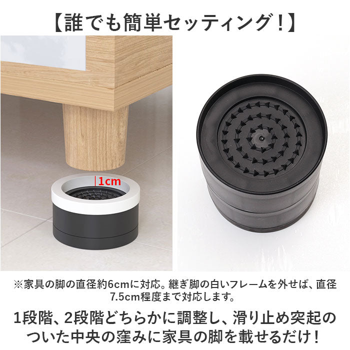 ・1段階、2段階どちらかに調整し、滑り止め突起のついた中央の窪みに家具の脚を載せるだけ!