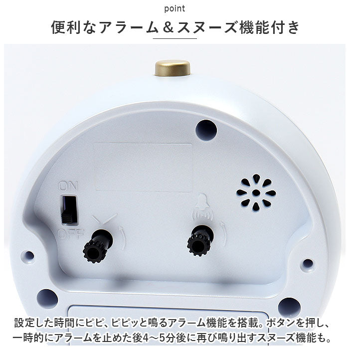 ・設定した時間にピピ、ピピッと鳴るアラーム機能を搭載。ボタンを押し、一時的にアラームを止めた後4~5分後に再び鳴り出すスヌーズ機能も。